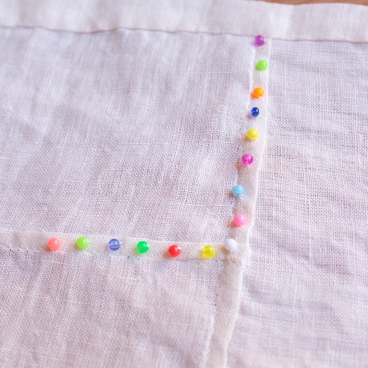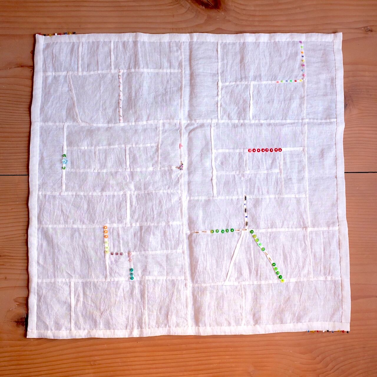 白色のリネンをベースにビーズやスパンコールを縫い付けて作ったポジャギです。