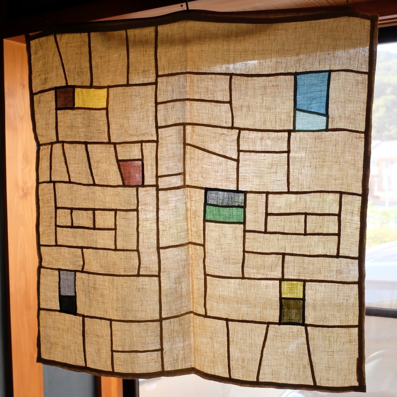 菜種色のリネンをベースにカラフルな理念を入れて作ったポジャギです。