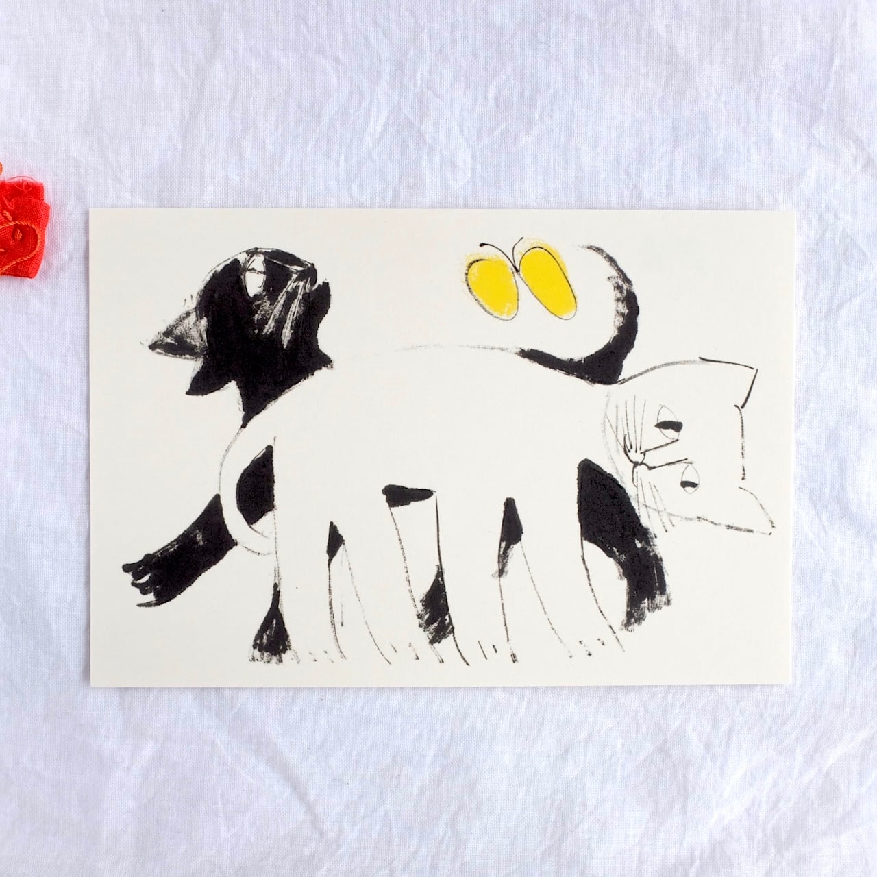 【きくちちき】ポストカード「しろねこくろねこ・二匹と蝶」